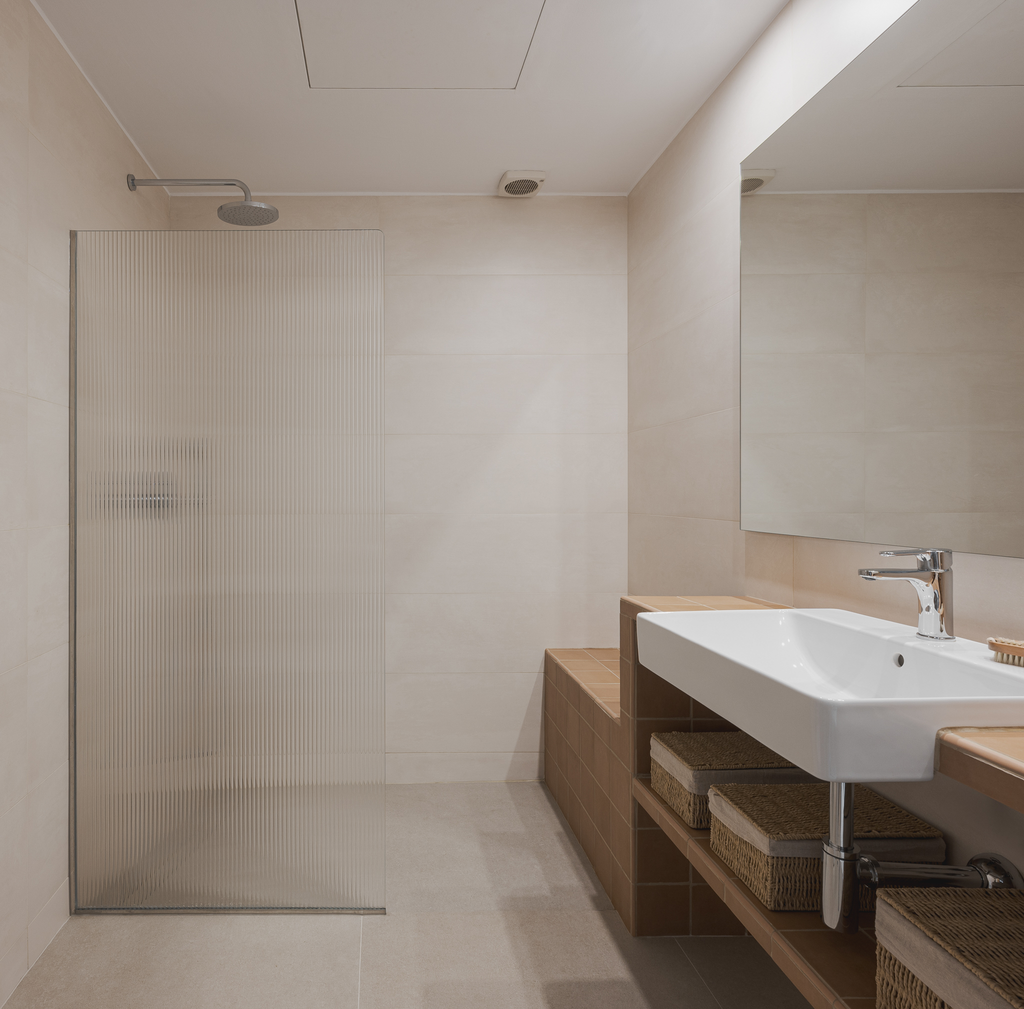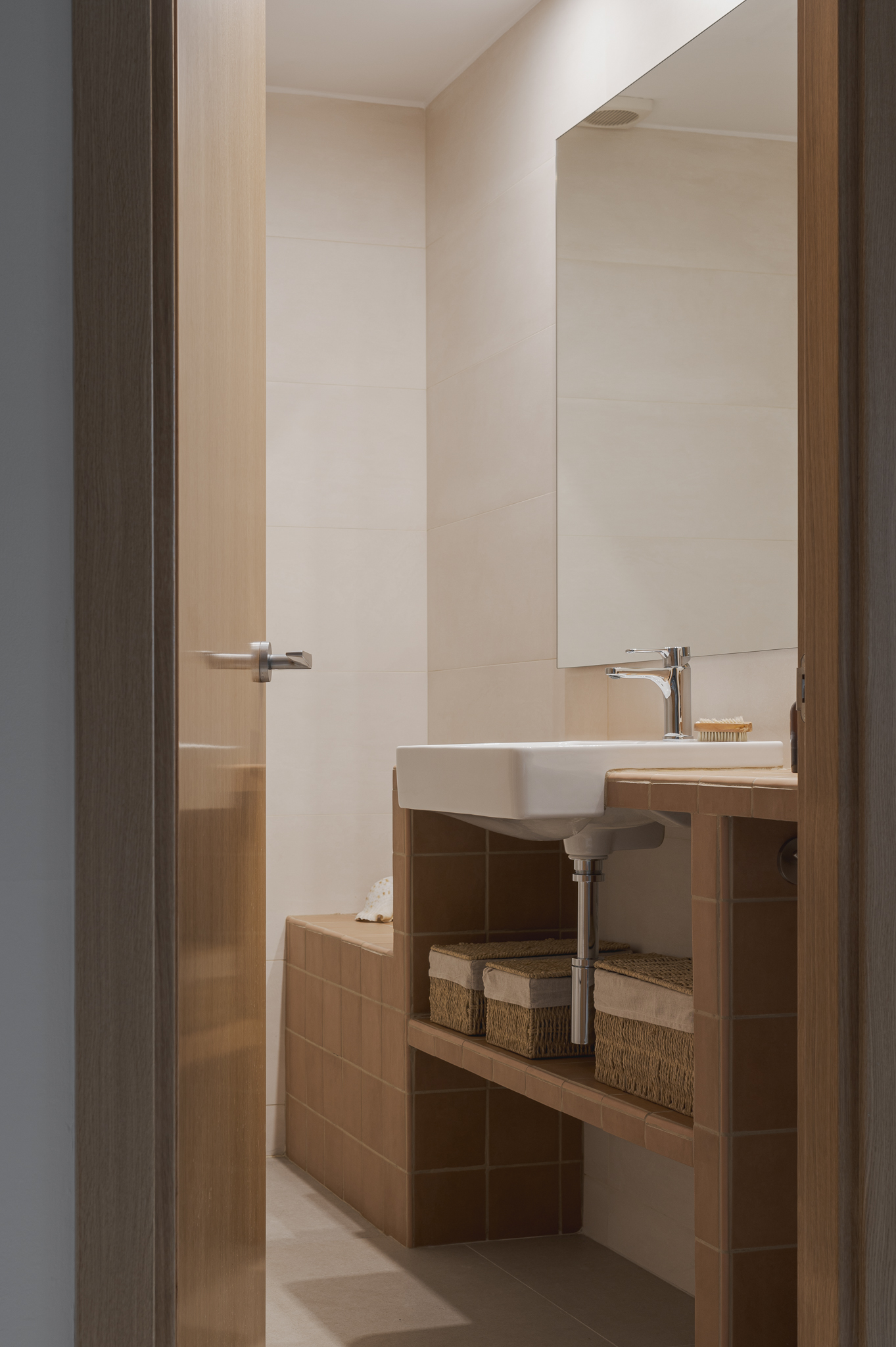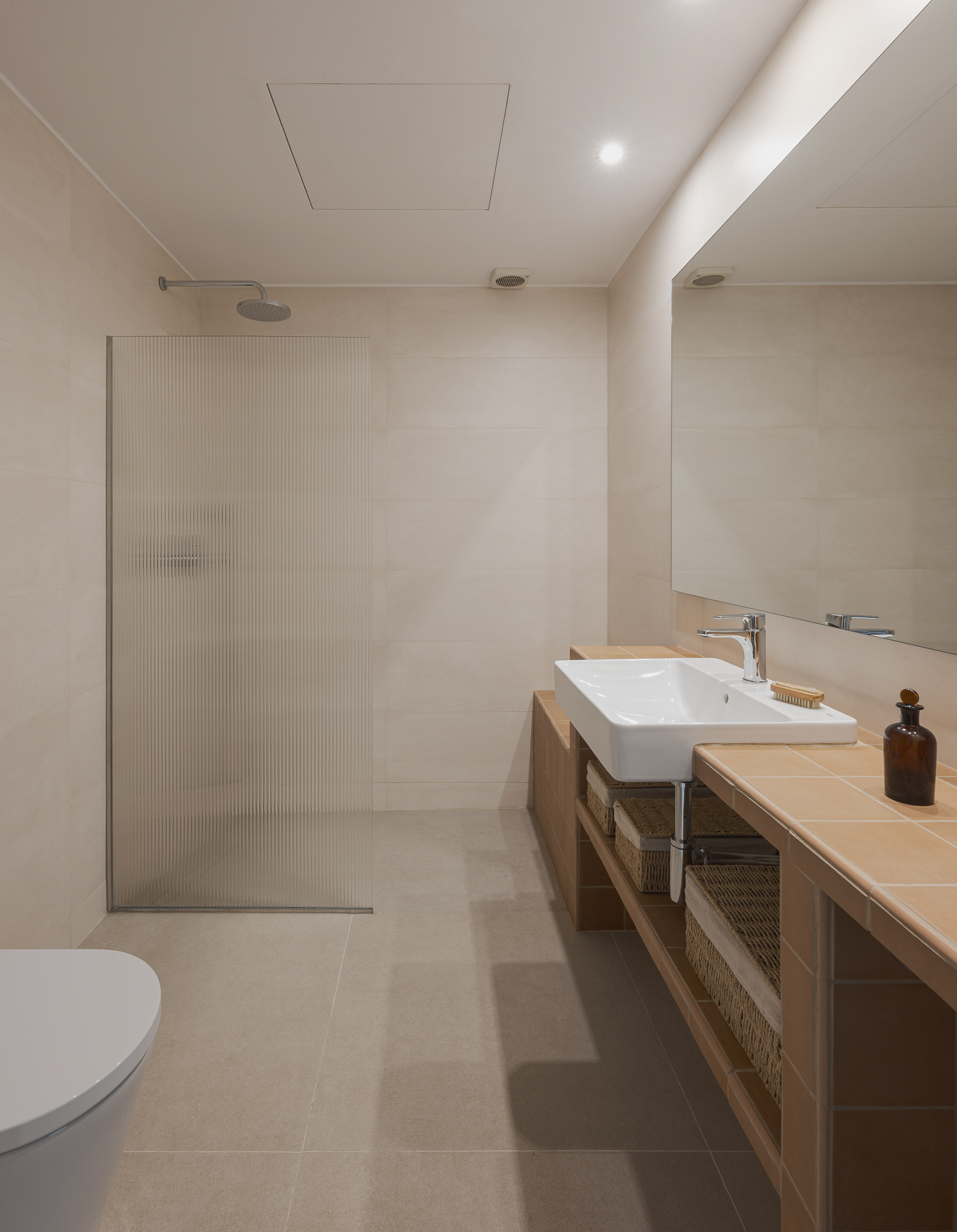 Amb l’objectiu d’assolir funcionalitat i harmonia entre els diferents elements, s’ha projectat un moble d’obra que vertebra i organitza l’espai en diversos àmbits. La zona de dutxa incorpora un petit banc que permet seure i endreçar les saboneres; la zona de la pica es completa amb una lleixa inferior i, a l’entrada, amb un element divisor que fa possible penjar-hi la tovallola de mans i integrar-hi la paperera. Per garantir una certa intimitat, un vidre acanalat, que actua com a mampara, separa la zona de dutxa. La il·luminació es resol amb tres punts de llum situats davant d’un gran mirall, que en dispersa la claror i contribueix a ampliar visualment l’espai.