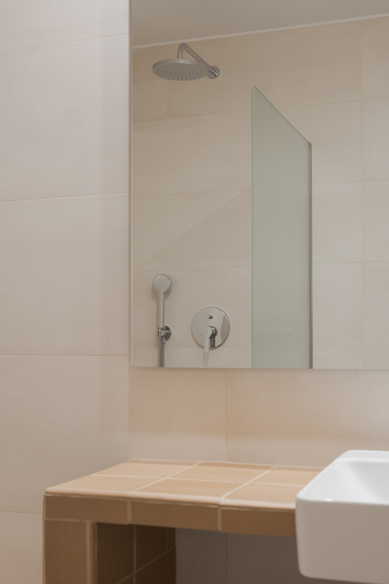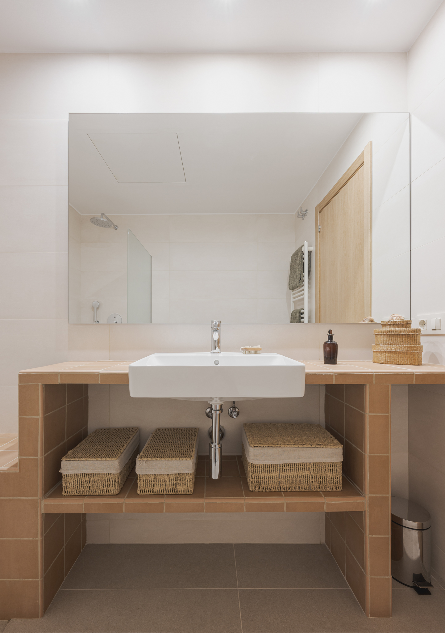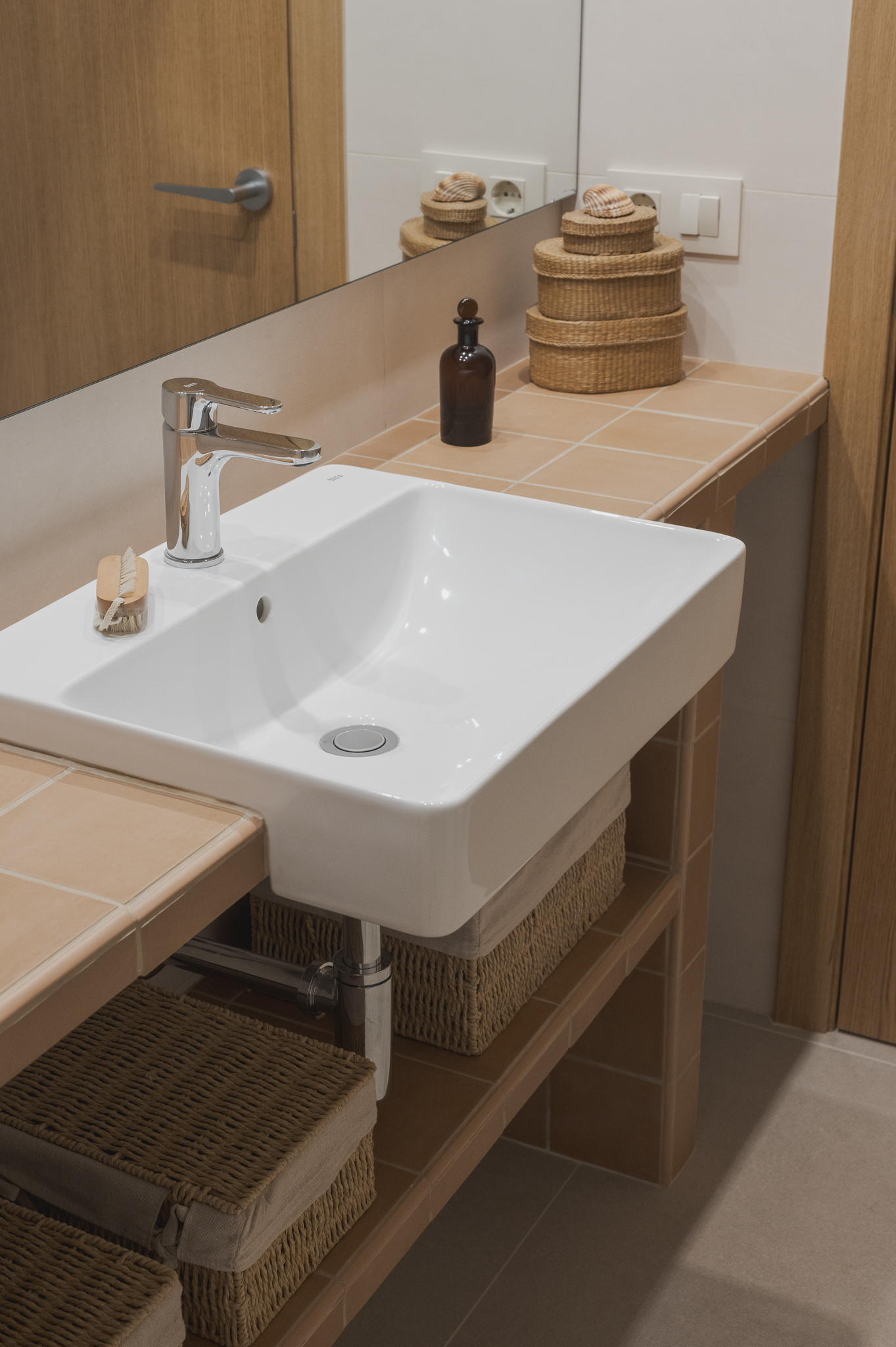 Amb l’objectiu d’assolir funcionalitat i harmonia entre els diferents elements, s’ha projectat un moble d’obra que vertebra i organitza l’espai en diversos àmbits. La zona de dutxa incorpora un petit banc que permet seure i endreçar les saboneres; la zona de la pica es completa amb una lleixa inferior i, a l’entrada, amb un element divisor que fa possible penjar-hi la tovallola de mans i integrar-hi la paperera. Per garantir una certa intimitat, un vidre acanalat, que actua com a mampara, separa la zona de dutxa. La il·luminació es resol amb tres punts de llum situats davant d’un gran mirall, que en dispersa la claror i contribueix a ampliar visualment l’espai.